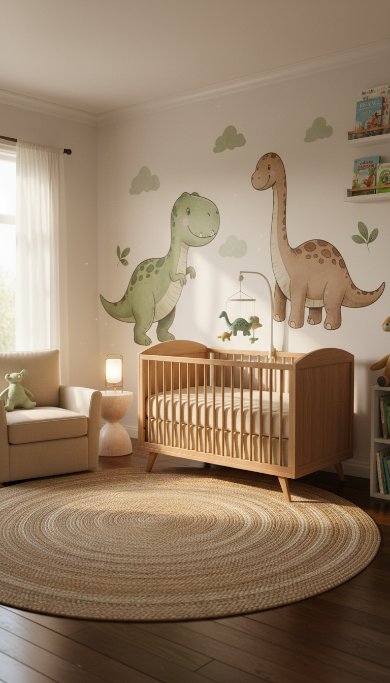 Embrace the enduring appeal of traditional dinosaur decor with a classic expedition theme. This style often features friendly, large-scale dinosaurs like a T-Rex or Brontosaurus, rendered in a warm palette of greens, browns, and earthy tones. Natural wood elements and soft textiles enhance the cozy, timeless feel, creating a welcoming environment that never goes out of style. It’s a design that feels both nostalgic and exciting, perfect for a little explorer’s first steps into the world.