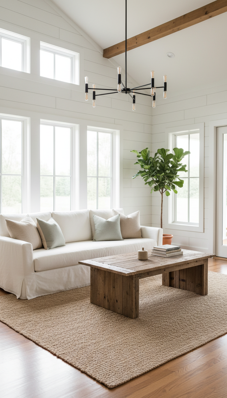Bring a free-spirited and eclectic vibe to your farmhouse living room with a bohemian fusion. This style blends the relaxed charm of farmhouse with global patterns, vibrant textures, and an abundance of plants. Think macrame wall hangings, Moroccan poufs, and patterned rugs layered over natural fiber mats. While maintaining a neutral farmhouse base, introduce pops of earthy colors like terracotta, mustard yellow, and deep teal through textiles and decor. The result is a vibrant, personalized space that feels well-traveled and utterly unique, filled with warmth and an artistic sensibility.
