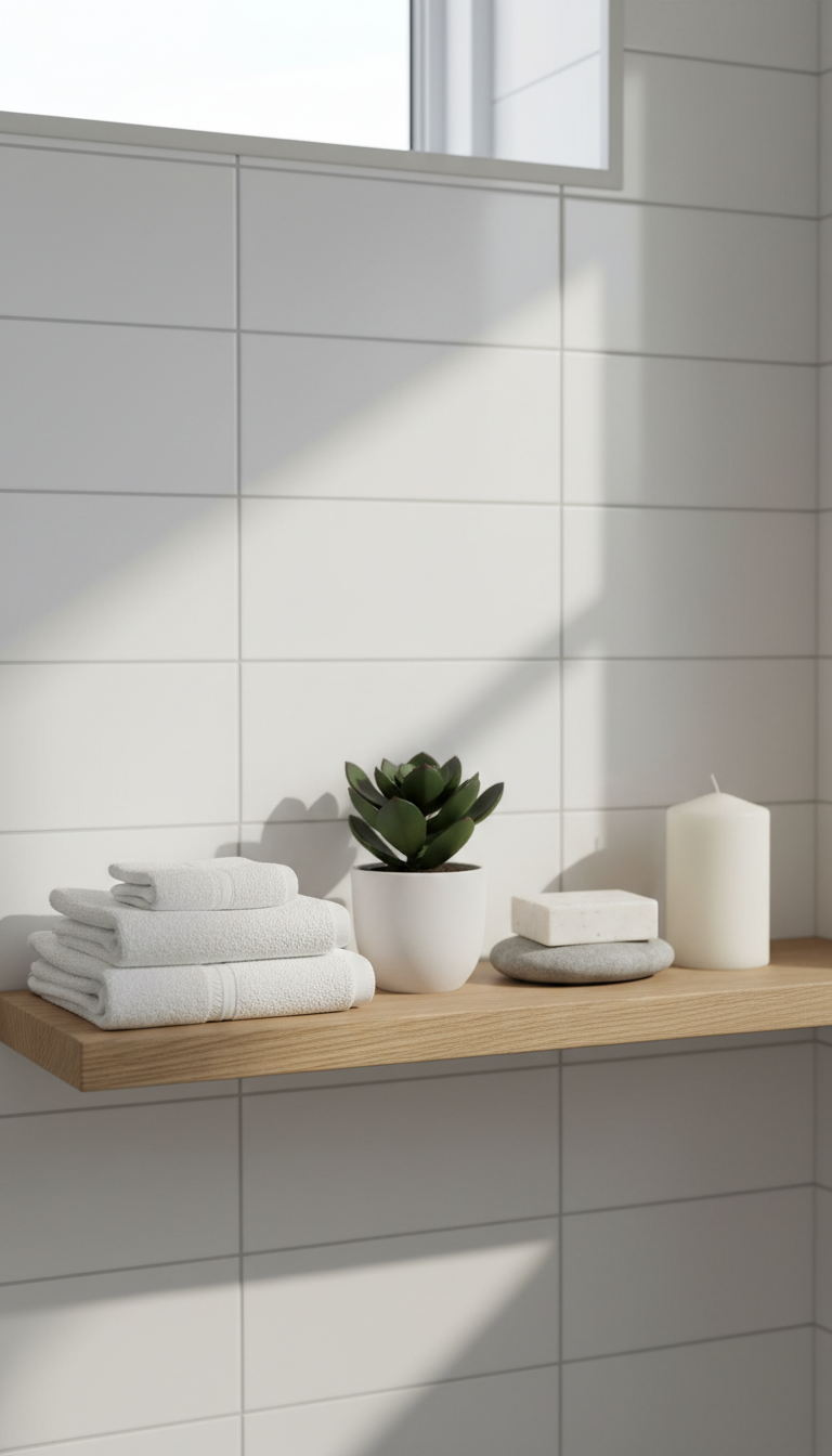 Create a serene escape with clean lines, neutral colors, and natural textures. Focus on simplicity, incorporating elements like neatly folded white towels, small potted succulents, a smooth stone soap dish, and perhaps a single elegant candle. The aim is tranquility and an uncluttered calm, allowing the space to breathe and evoke a high-end spa experience. Keep items sparse but impactful, emphasizing quality over quantity to promote a truly relaxing atmosphere.