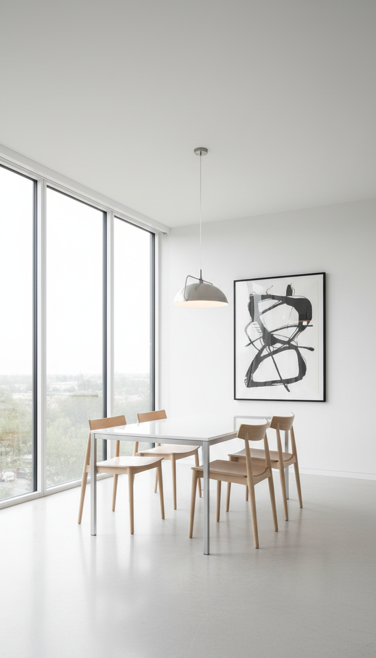 Embrace clean lines and uncluttered spaces with a modern minimalist dining room. This style prioritizes functionality and simplicity, often featuring a neutral color palette of whites, grays, and blacks. Furniture is streamlined, geometric, and free of excessive ornamentation, creating a sense of calm and openness. Sparse decor, perhaps a single large piece of abstract art or a minimalist centerpiece, enhances the sophisticated yet understated atmosphere. The focus is on quality materials and the beauty of essential forms, fostering a serene dining experience. Natural light is key to making these spaces feel expansive and welcoming.