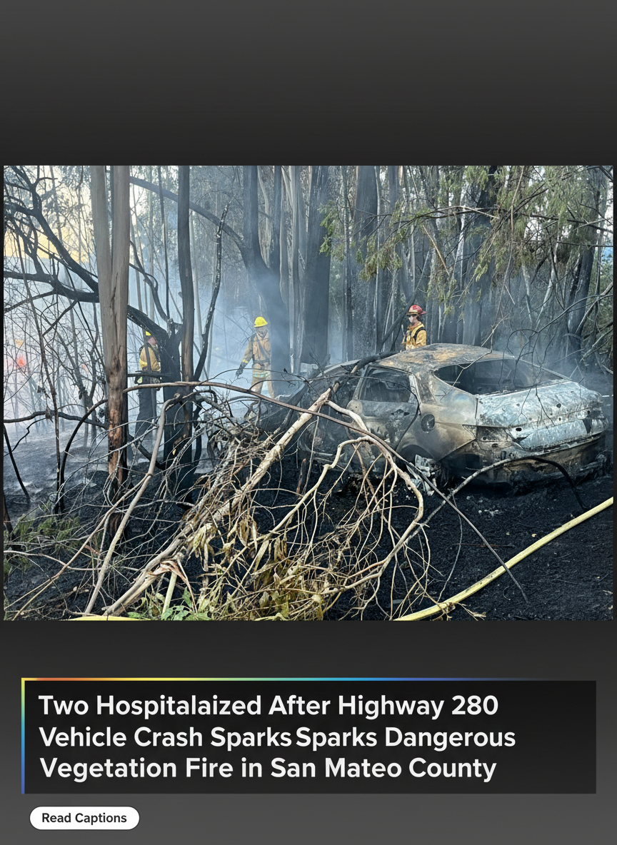 SAN MATEO COUNTY, Calif. — A dramatic roadside accident escalated into a brush fire Tuesday evening, leaving two people injured and prompting a rapid response from emergency crews along Interstate 280.