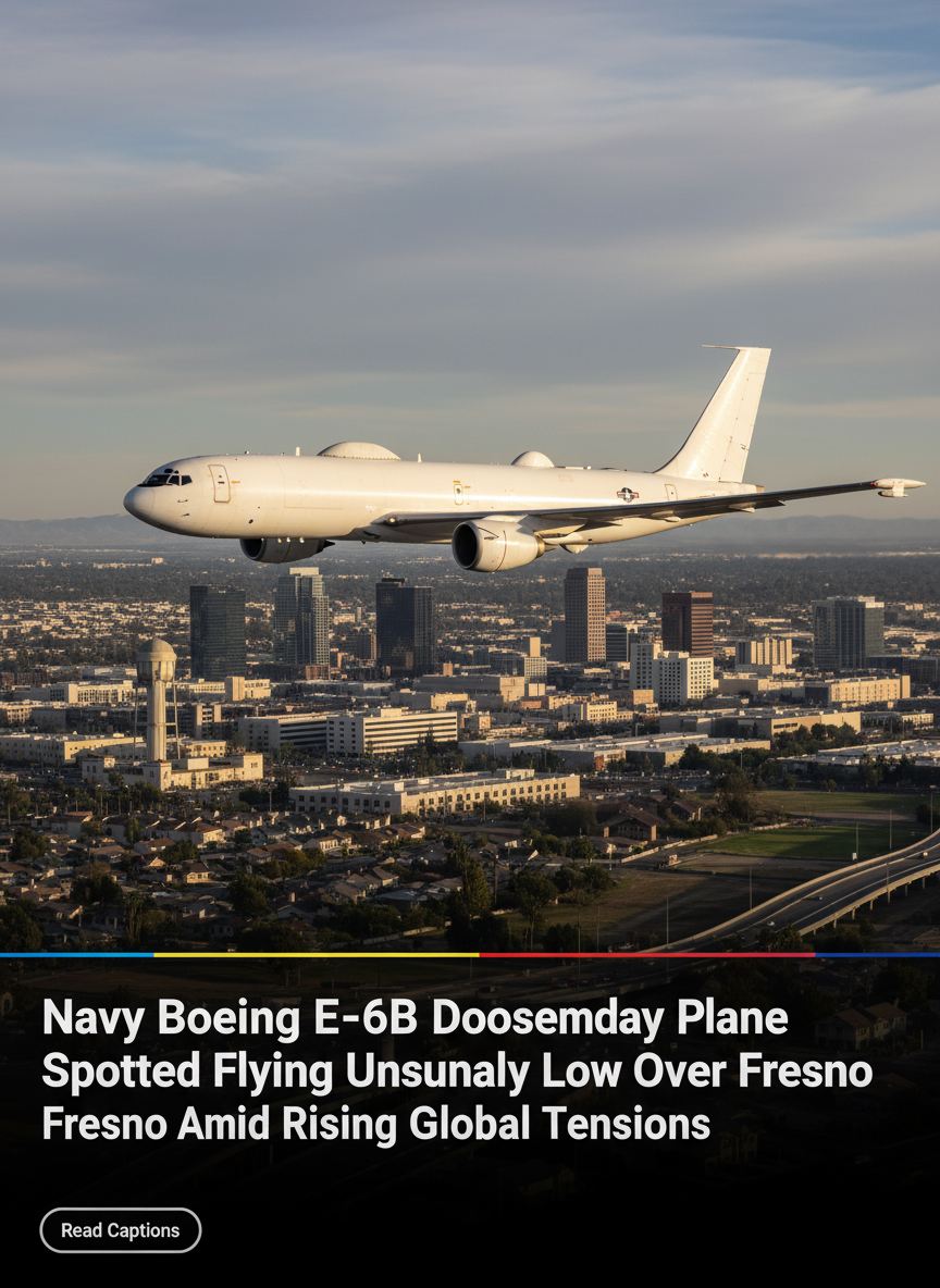 On Sunday afternoon, an unmarked Boeing E-6B Mercury—a sophisticated communications relay and strategic command post operated by the U.S. Navy—was observed circling the Fresno Yosemite International Airport. Witnesses reported that the aircraft spent approximately 30 minutes in a low-level holding pattern, an altitude described by aviation enthusiasts and locals as “unusually low” for the massive four-engine jet.