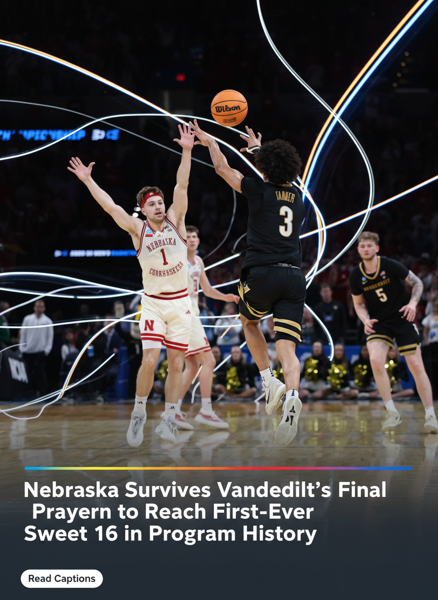 In a finish that will be etched into NCAA Tournament lore, the Nebraska Cornhuskers narrowly avoided a heartbreaking collapse on Sunday, surviving a last-second miracle attempt to defeat Vanderbilt and advance to the Sweet 16 for the first time in program history. The victory marks a monumental milestone for a basketball program that has long lived in the shadow of its football counterpart.